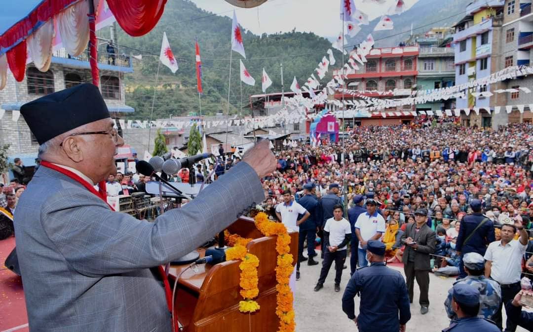 ‘यो निर्वाचन देशको भविष्यसँग जोडिएको छ, राष्ट्र जोगाउनेलाई जिताउने हो या गठबन्धन गरेर भागबण्डामा रमाउनेलाई जिताउने त्यो जनताको हातमा छ’ ओलीले भने ‘एमाले मात्रै विकास गर्ने पार्टी हो, यहाँ जनताका समस्या एमालेले मात्र बुझेको छ।’