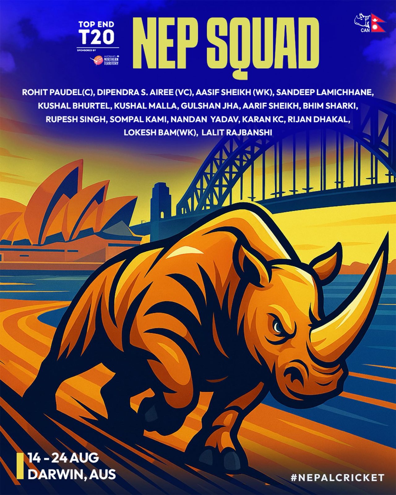 काठमाडौं, २० साउन । अष्ट्रेलियामा हुने टप एन्ड टी–२० सिरिज खेल्ने नेपाली टोलीको घोषणा भएको छ । नेपाल क्रिकेट संघ क्यानले रोहित पोडेलको कप्तानीमा १६ सदस्यीय सिरिज खेल्ने टोलीको घोषणा गरेको हो ।
