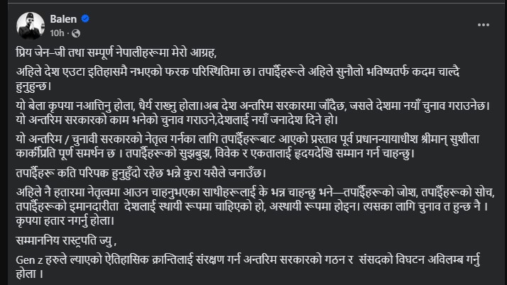 जेनजी प्रतिनिधिहरूले कार्कीलाई नयाँ नेतृत्वका लागि प्रधानसेनापति अशोक सिग्देलसमक्ष प्रस्ताव गरेकोमा मेयर बालेनले पनि यसमा समर्थन जनाउनुभएको हो । तर, त्यसअघि संसद् विघटन गर्नुपर्ने उहाँको माग छ ।