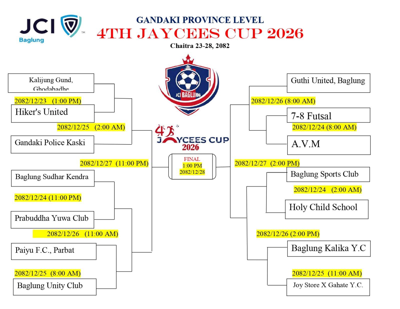 गण्डकी प्रदेशस्तरमा खुला प्रतियोगिताका रूपमा जेसिज कप आयोजना गर्न लागिएको बागलुङ जेसीज वर्ष २०२६ का अध्यक्ष अन्जिला श्रेष्ठले जानकारी दिनुभयो । उहाँले जेसीजले हरेक वर्ष जिल्लाका खेलाडीलाइृ प्रोत्साहन गर्दै नयाँ खेलाडी उत्पादनमा सहयोग पु¥याउन प्रतियोगिता संचालन गर्दै आएको बताउनुभयो ।