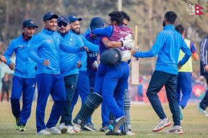 काठमाण्डौ, ८ फागुन । आईसीसी विश्व कप क्रिकेट लिग–२ अन्तर्गत त्रिदेशीय एकदिवसीय शृङ्खलामा नेपालले स्कटल्यान्डलाई हराएको छ । स्कटल्यान्डले दिएको २ सय १३ रनको लक्ष्य